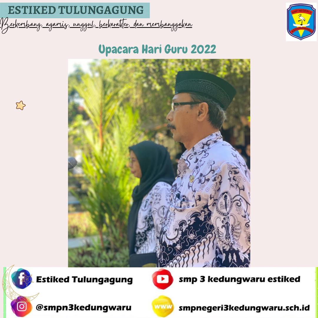 Pada hari Jumat, 25 November 2022 telah dilangsungkan upacara peringatan Hari Guru Nasional 2022 di SMPN 3 Kedungwaru. Hari Guru mempunyai makna sebagai bentuk penghormatan kepada guru atas jasa-jasa yang telah dilakukan selama. Karena kita tahu bahwa guru merupakan pahlawan tanpa tanda jasa.